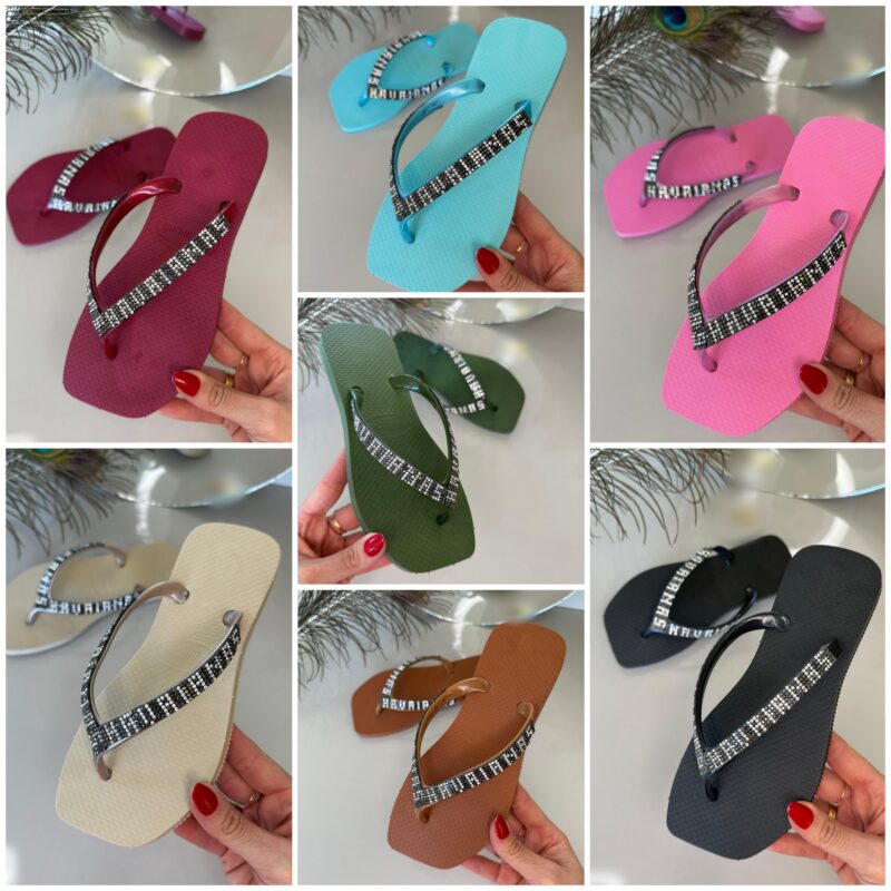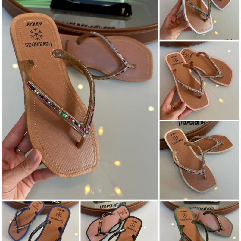 Grade com 12 pares, 7 cores diferentes na grade. Sola quadrada no PVC micro 100% virgem. correia com manta de strass colada. (trabalho manual) Numeração padrão de fábrica (não muda, não troca, não altera.) 2 – 33/4 4 – 35/6 4 – 37/8 2 – 39/0 Obs: Trabalhamos com chinelos réplica, feito a mão, podendo…